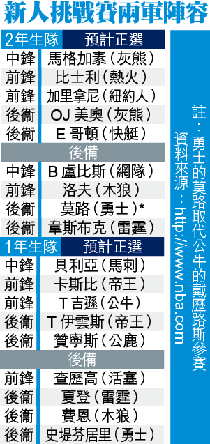 09年「最佳新人」公牛的戴歷路斯,因需同時出席技術挑戰賽及明星賽,行程過於繁忙令他棄戰新人賽,但亦無損由2年生對1年生的「新人賽」精采程度。皆因2年生隊擁有灰熊「雙俠」中鋒馬格加素、OJ美奧,還有近期越戰越勇的雷霆控衞韋斯布克,陣容堪稱完美,而「三叉戟」的合作更令球迷熱血沸騰,勢必掀起搶分高潮。
