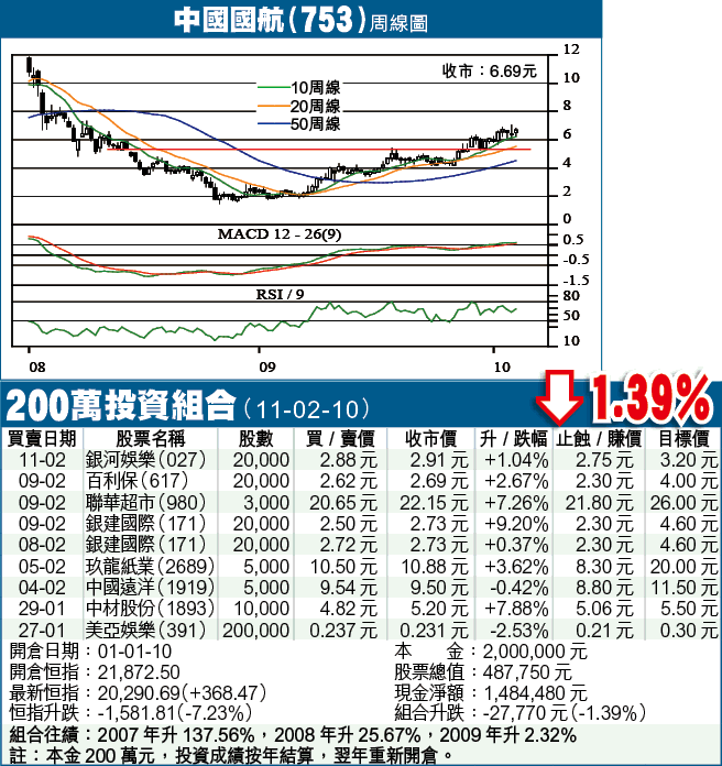 受金融海嘯打擊,國航08年度虧損92.55億元(人民幣.下同),但去年已見改善,最近更發出盈喜。去年首3季,國航已累賺38.1億元,估計全年約賺48億元,每股盈利39.2分,折約0.44港元,現價PE15倍,以一隻復蘇股計,並不算貴。