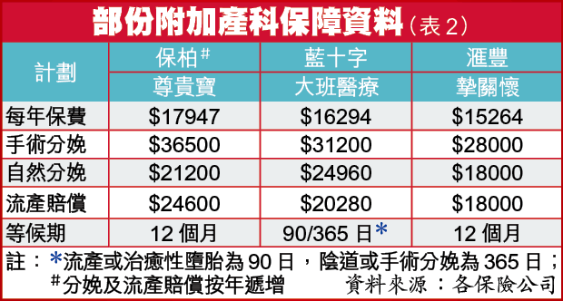 保柏、藍十字及滙豐有提供或自選產科保障計劃,投保後並非立即生效,產科保障要有指定時限,投保人於期內懷孕,或未能得到保障。保柏及滙豐等候期為一年,而藍十字則分兩類,陰道或手術分娩要等365日,流產或治癒性墮胎為90日(表2)。