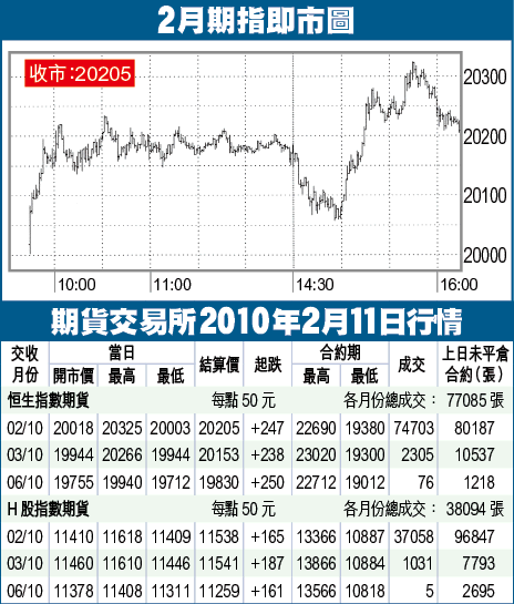 期指昨日裂口高開,重上20000關,突破短線阻力,走勢持續轉好,以20205高收,升247點,轉低水85點,成交合約減少至7.4萬張。