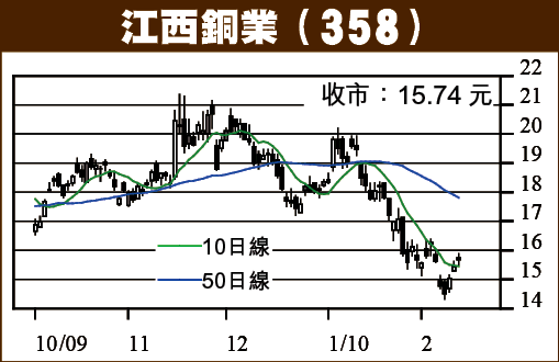 美元回落,商品價格回升,短線可吼一些商品股如馬鞍山鋼鐵(323)及江西銅業(358)等。由於早前此板塊跌勢過急,上升的空間頗大,故此值博率較高。馬鋼守穩4.50元水平,短線上望5.20元;江銅只要企穩16元之上,上望目標18元。