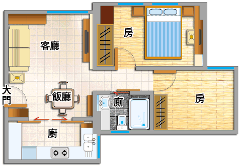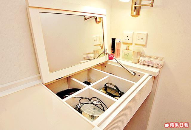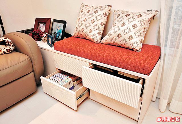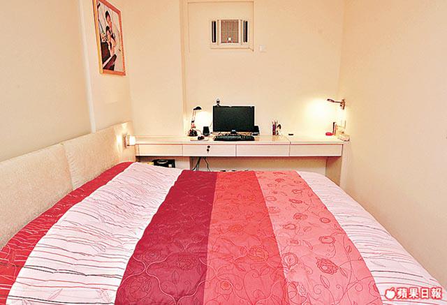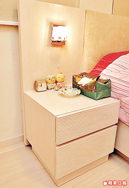 單位有兩間睡房,皆鋪上無縫木地板,觸感和視覺上都比較溫暖,淺色調則是刻意配合大廳地磚的安排。客房只擺放衣櫃,保留空間作為日後新安排之用;較大的一間是兩夫婦的寢室,長形間隔兩邊有柱躉,靠近大廳的一端建大櫃,內櫳較深的部份作為衣櫃,建在柱位上的大櫃較淺,但亦足夠擺放雜物。三扇大櫃門均鋪上米色鱷魚皮紋人造皮。鱷魚皮紋近年漸見流行,燈光映照下產生不同亮光色澤,較一般木面或玻璃面,多一份變化和高貴。