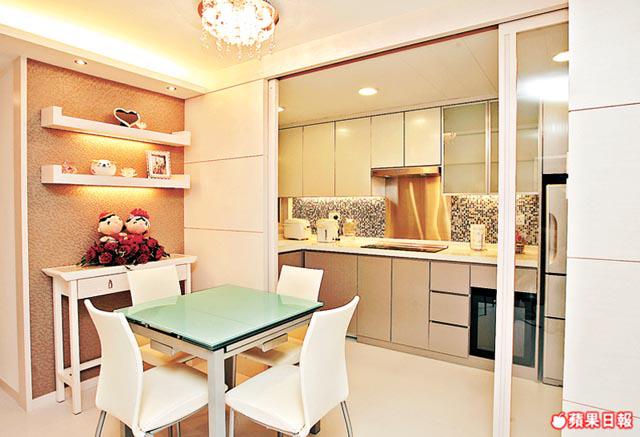 開放式廚房流露型格,同時亦可彌補間隔上的不足。這個單位大廳空間向橫發展,尤其飯廳與廚房空間比例不均,反正無飯夫妻不懼油煙,索性拆牆打通兩區,廚房加上飯廳,面積可與客廳媲美,整體觀感亦更寬闊。不過,考慮到無飯生活不可能永恒,日後添丁後,為了小朋友着想,確保家居安全亦非常重要,所以加上兩扇巨型玻璃趟門,可以適時分隔兩區,亦為將來的日常生活保留一點彈性。