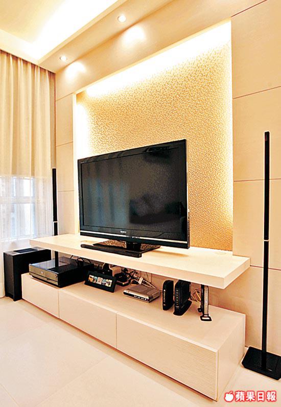 設計師表示,此屋樓底不足9呎,忌用大型吊燈,於是沿着客飯廳一邊牆身造燈槽配射燈,利用黃光暖化整體帶點冷的素淨空間,並有spotlight效果,突出淺灰色主題牆所在,讓視線有聚焦處。