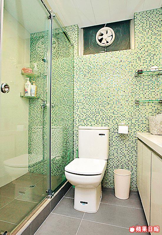 全屋是素淨米白的世界,惟獨浴室用色較為大膽,一整幅淺綠色牆身,配搭灰色地磚,撞出時尚型格。牆身紙皮石與廚房所用屬同一款式,只是色澤大異其趣,效果亦十分搶眼。
