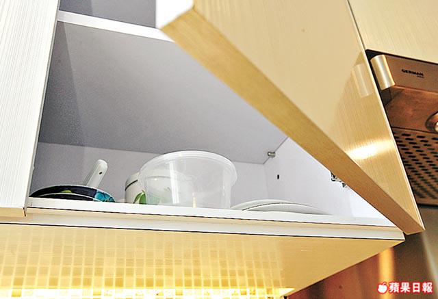 廚房改開放式,基本上已經成為大廳一部份,裝潢亦要配合大廳主題。最搶眼的大型廚櫃,選配淺灰色膠板櫃門,圍以不銹鋼外框,展現時尚風格。細看之下,廚櫃門既無手把亦無凹槽,原來是利用梯級形櫃邊與櫃門間形成坑槽,以拉動櫃門,設計簡單卻見心思,亦令廚櫃外觀保持簡約。