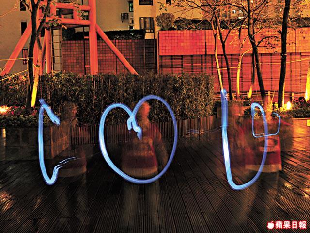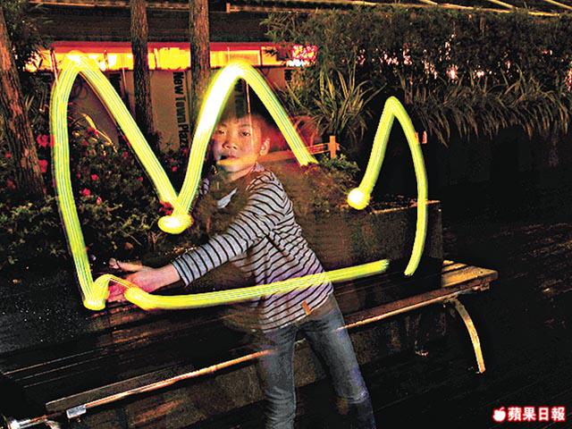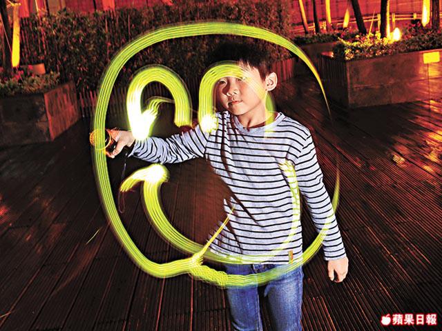 小朋友手拿電筒對着鏡頭,在空氣中畫出喜歡的圖案或文字。記住,文字必須「反轉」來寫,否則拍照出來,全部字體會前後左右反轉。