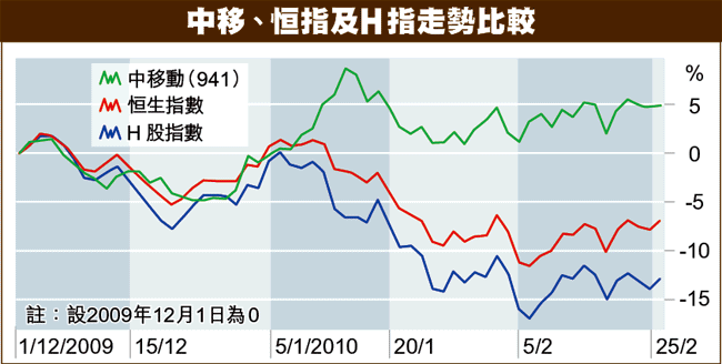 附圖是中移動、恒指及H股指數由去年12月至今的走勢表現,從圖中可見,近期中移動的走勢明顯跑贏恒指及H指,惟中移動早前公佈的數據,其1月份的上客量並非特別出色,只是2G業務較佳,筆者估計,近期中移動走勢轉強,相信是機構投資者基於近數月股市及經濟情況較波動,因而增持防守性較強的股份所致。
