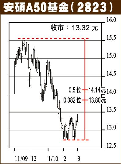 筆者察覺,A50自去年11月由15.54元高位反覆下挫至上月低位12.74元後,便開始逐步回穩,以量度反彈幅度0.382倍計算,其首個反彈阻力為13.80元,剛巧這亦是A50去年12月之低位,相信其阻力不輕,不容易一次便成功衝破。
