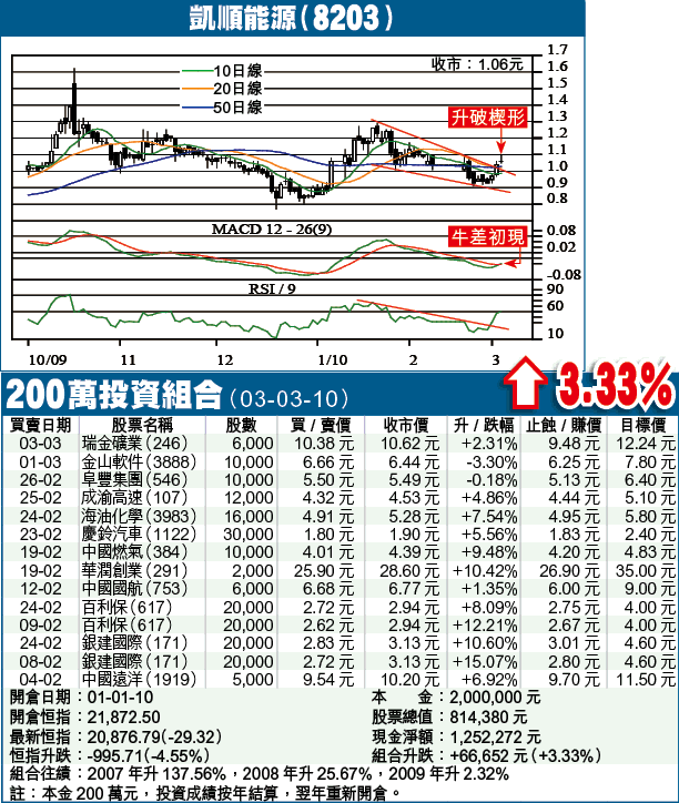 先講走勢,凱順1月下旬營造下降楔形,昨升破楔形,MACD重現牛差距,短期最小量度升幅目標1.29元,潛在升幅21.7%。
