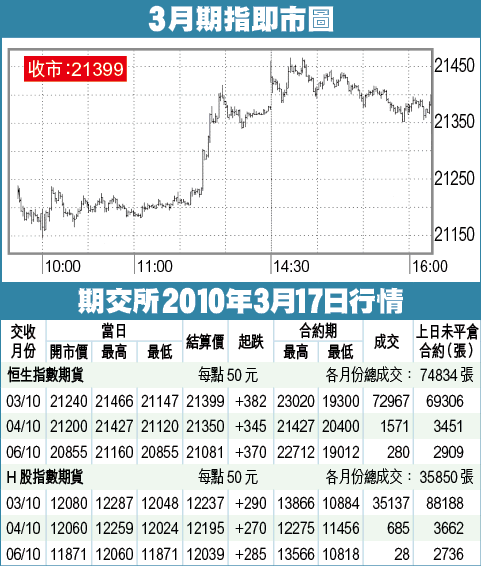 期指技術走勢轉強,周初調整幅度溫和,守穩短期升軌,昨日在波幅大增下破位,市場氣氛有改善,短期將試保歷加通道頂線21500或以上,甚至有機會在結算後突破22000關,短線支持位上移,10日及20日線會有良好支持。