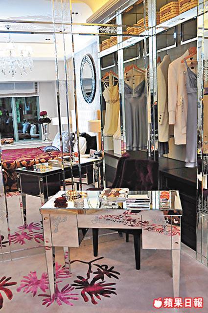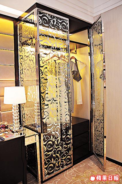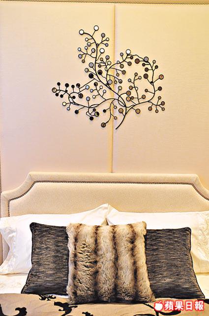 三間房各有不同花紋配搭,450平方呎的主人房地毯及被鋪以同系列的花紋作主調,由於面積夠大,佈局上可劃分為睡房和梳妝衣帽間。天花水晶燈精緻而高貴,水晶串為燈飾設計帶來柔和線條美。床頭牆上放置一塊大圓鏡,於倒影中看到天花水晶燈,感覺猶如多了一盞燈。衣櫃則用鏡面設計,令空間感大增。電視牆那幅看似簡單的花朵牆紙,實則鑲有閃石。再留心觀察,你會發現周邊的小擺設或飾品,幾乎都鑲有水晶或閃石,進一步提升高雅風格。至於梳妝枱及衣櫃,則全面使用鏡子,營造空間感時還能反襯水晶燈的光芒,實典雅而溫暖。