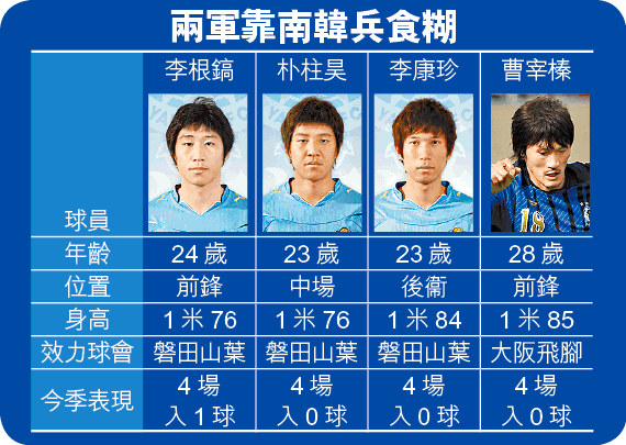至於大阪飛腳的前線亦要倚靠南韓兵的曹宰榛,皆因盧卡斯施維連奴受傷,柏度祖尼亞遭球會處罰停賽,在沒有選擇下,成為必然正選前鋒,惟狀態一般。