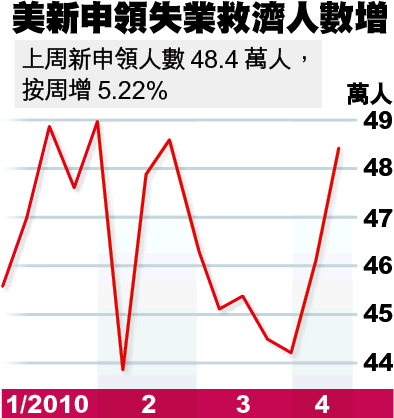 美國上周新申領失業救濟人數出乎意料急增2.4萬人,至48.4萬人,與市場預期降至44萬人大相逕庭;4月紐約州製造業指數則由22.9急升至31.9,為去年10月以來最高,並遠勝預期。Federated首席股票策略師奧蘭度表示,製造業擴張步伐明顯加快,相信就業市場未惡化,失業人數急增可能與復活節假期的季節性因素有關。