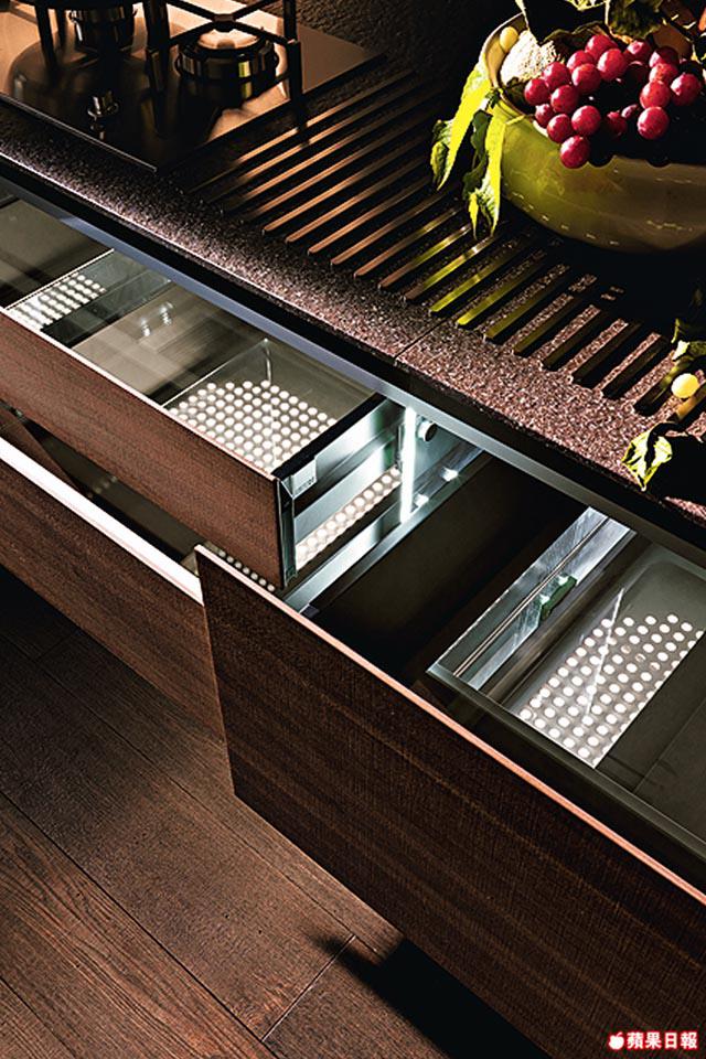 ValcucineNoceTattile長達三米的玻璃廚櫃,以強化玻璃作框架,在廚櫃界中少有,皆因這種設計講求非常高的準確度及堅固度才能做得到。以玻璃作物料,除通透型格外,可減少使用膠水,有助減少甲醛排放,而且物料能循環再用,兼具防濕防潮,堅實抗刮,很適合香港的潮濕天氣。(91×362cm)約$60萬/a