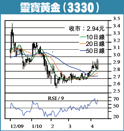 靈寶黃金(3330)昨收2.94元,升3.5%。股價於10日與20日線水平橫行整固了一段頗長時間,上周嘗試上破100及250日線,雖然未能突破,但股價緊貼兩阻力線位橫行,向上破關的機會正增加,股價升破3元關後,料會上試3.20至3.46元阻力,若進一步破關可重展升浪。