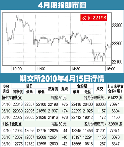 期指高開190點至22313,彈升至22357即見阻力,持續近日上落市格局,以22198收市,升75點,高水41點,成交合約增至6萬張。