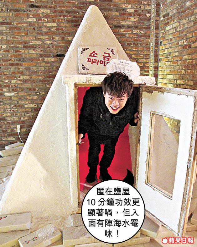 之後,我們來到新安郡的曾島,此島08年被選為slowcity,全無污染,還全島禁煙!我山長水遠而來,是為了去鹽洞!鹽洞,不是明洞和新沙洞之類的購物熱洞,是名副其實以海鹽堆成好似鐘乳石石洞咁。島上的太平鹽田全韓國最大。為推廣生態旅遊,鹽田旁有鹽博物館,遊客亦可製作海鹽和落鹽田曬鹽!不過甚麼活動,也不夠那個聲稱能醫百病的鹽洞神奇。入到去,其實乜都唔使做,只要平躺在床上就可。飲埋杯竹鹽鹽水,味道好似……烚蛋!究竟有咩功效?原來東歐早有研究,睡鹽洞有效舒緩敏感、哮喘、壓力和濕疹等,搞到飽受鼻敏感困擾,日日擤個不停的我,好想買一袋海鹽返屋企當牆紙鋪。最緊要是鹽洞還有舒緩潰瘍作用,爛面又生飛滋的我,都係索性在此長住,做個穴居人算了。臨別,他們送我成包米咁重的海鹽。若是以前,我會禮貌地回絕,並頭頂冒出一大個bubble:「你玩我咩!」今次,我立刻收下,開心都嚟唔切。
