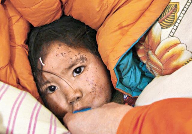 受低溫及大風天氣影響,昨日玉樹災區更添慘況。用作緊急避難場所的玉樹州體委操場上,救援人員支起40多頂帳篷,但仍有大部份災民露天躺在操場上。缺乏棉被下,不少災民僅用棉絮覆蓋身體,小孩席地而睡。部份整天沒吃沒喝的學生則只能用膠袋蓋着身體禦寒。操場上隨處可見受傷和哭泣的災民,不少藏族災民一見到醫護人員就伸出雙手拇指,意思是請求幫助。夜晚操場寒氣逼人,災民在露天都凍得瑟瑟發抖。