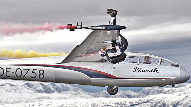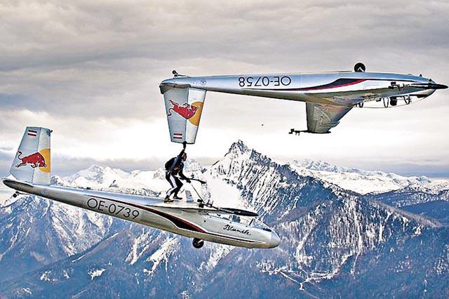 飛機「坐」得多,但斯坦納(PaulSteiner)的方法大概最亡命。這位奧地利跳傘高手藝高人膽大,不乖乖坐在機艙中,卻在2,000米高空上,爬出滑翔機外,在機頂機翼上迎風翱翔,更嘗試「高空轉機」──由一架機翻身換到另一架飛機上!