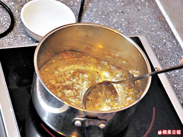 5. 馬蹄粉加少許水拌勻後倒入(4)中,開慢火煮滾,上碗後灑入少許桂花即成。