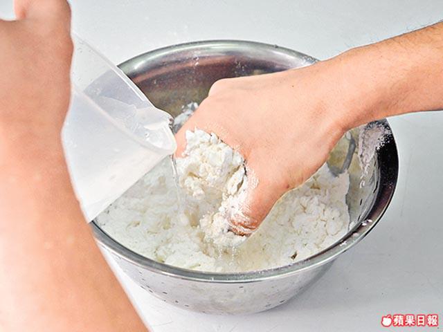 1. 將水逐少加入糯米粉搓勻成軟滑麪糰。
