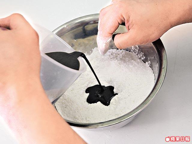 2. 將芝麻漿加入糯米粉,搓成軟滑麪糰。