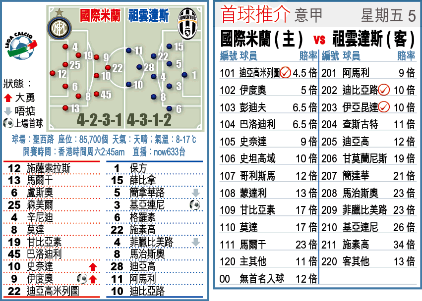 據《米蘭體育報》披露,祖雲達斯已訂下3年內動用2億歐元(約21億港元)以重建王朝的大計;惟那是未來的事,當下有場客征國際米蘭的周五意甲優先場,依近況,這一關是過不了,宜取國際米蘭主W。(球賽編號:星期五5;now633台明日2:45am直播)藍鑽石