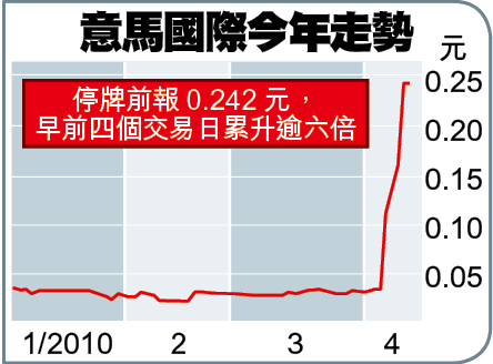 事實上,意馬於上周五除權日已大升2.2倍;停牌前累計四個交易日,意馬升幅更達616%,成交股數達66.7億股,相等於其已發行股本1.85倍。