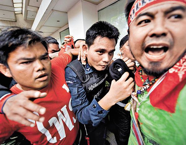 泰國潑水節甫結束,反政府紅衫軍仍未決定採取甚麼行動之際,當局昨晨(周五)派出特種部隊包圍一間酒店,企圖高姿態拘捕三名紅衫軍領袖,豈料功敗垂成,對方戲劇性游電線或跳窗逃脫,並挾持兩名警官作人質,令當局極度尷尬,總理阿披實(AbhisitVejjajiva)被迫取消開記者會。