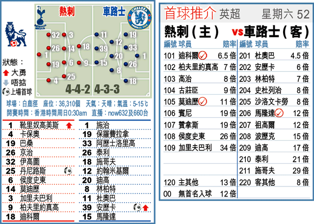 周末英超「早場」後,榜首形勢或已出現變化,不變是結果如何亦無損熱刺在「壓軸場」爭前4的動力。熱刺既可令阿仙奴不好受,今乘勝迎車路士亦可當攔路虎,「主勝」好路。(球賽編號:星期六52;now632及660台明日0:30am直播)