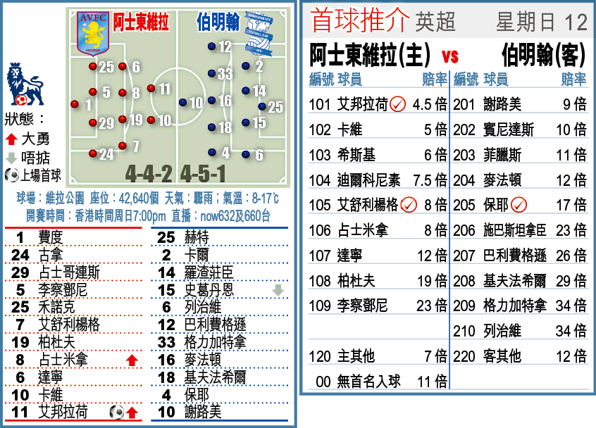 至於同日早場上演中部打吡,由阿士東維拉迎戰伯明翰。由於伯明翰已失去早前的銳氣,而維拉又仍有望爭第4位踢下屆歐聯,加上維拉一眾攻擊球員如艾邦拉荷及占士米拿等都當「弗」,維拉可捧。(球賽編號:星期日12;now632及660台今日7:00pm直播)文:吾中