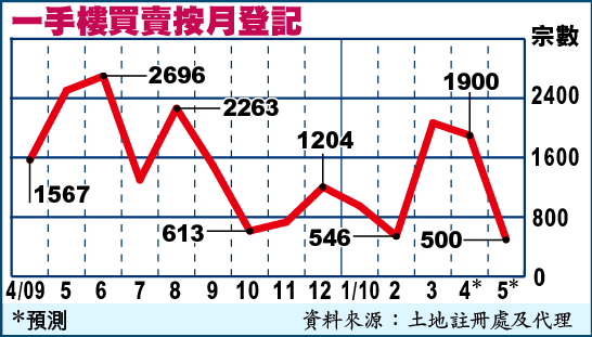 周滿傑稱,市場預期本月開賣的新盤,有機會延遲推出,直接影響銷售數字,情況將於下月的登記中反映,估計僅得500宗,較4月急跌逾70%。