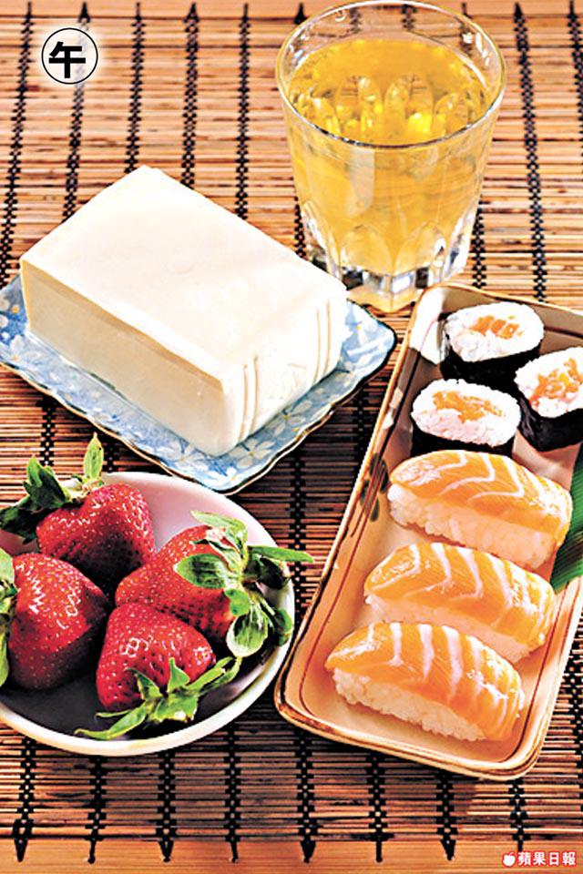 午餐:三文魚壽司6件、冷豆腐1件、蘋果蘆薈汁1杯、士多啤梨4粒
