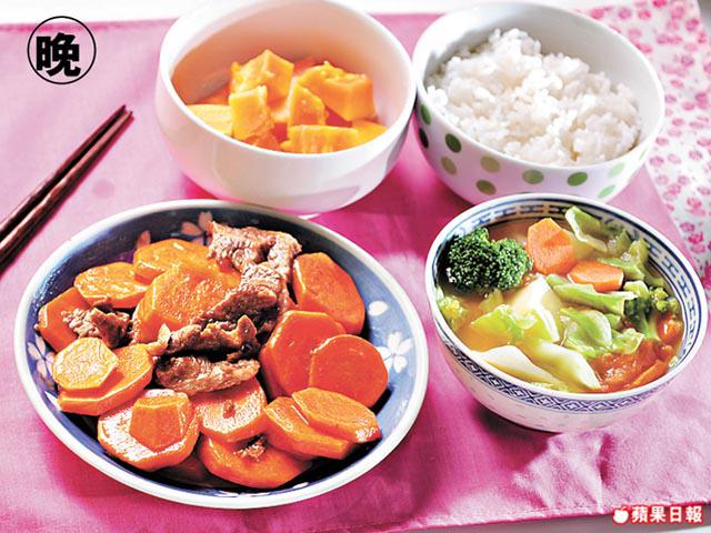 晚餐:白飯2/3碗、紅蘿蔔炒牛肉1碗、豆腐煮魚塊1碗、雜菜湯1碗、木瓜半碗