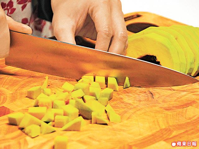 1. 南瓜切粒;紅蘿蔔切粒,備用。