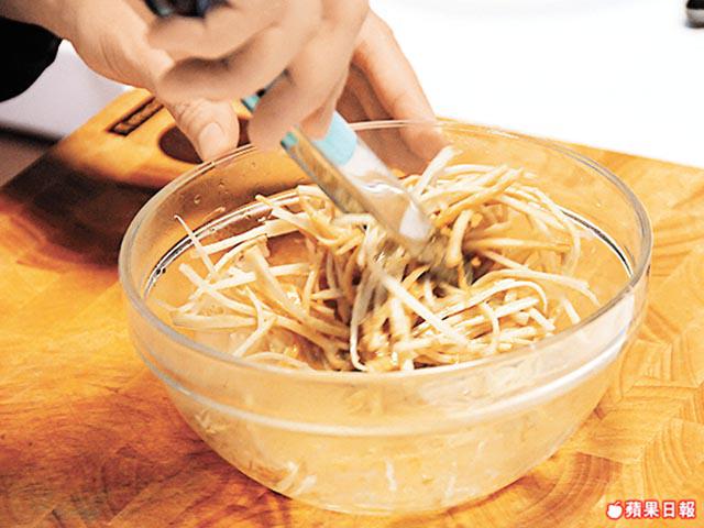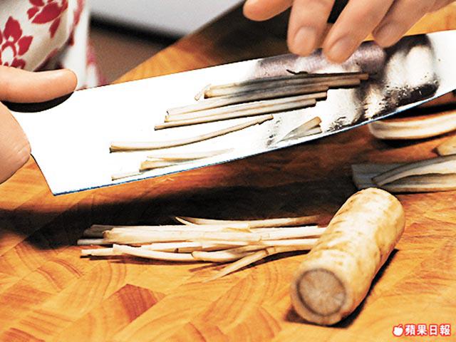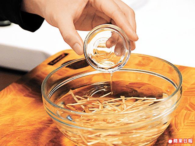 1. 用錫紙洗擦牛蒡後切幼絲,放入清水,加幾滴醋浸10分鐘。