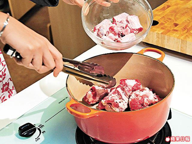 2. 燒熱鍋下橄欖油,放入牛尾,用大火煎至轉啡色後,撈起備用。