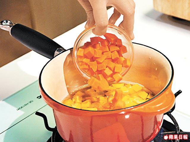 2. 開大火,將雞湯煮滾,放入南瓜粒、紅蘿蔔煮軟。