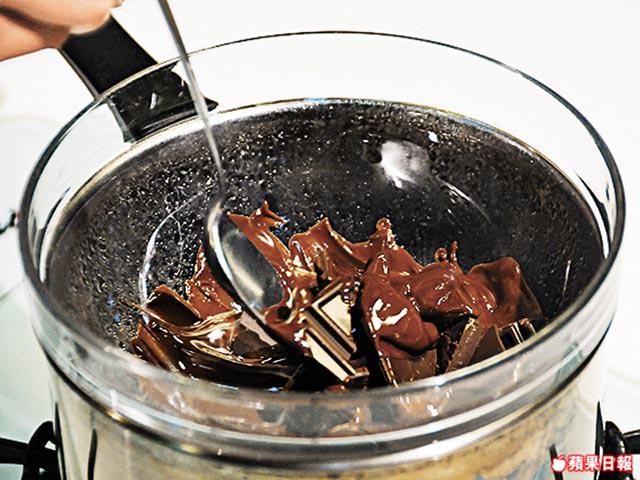 2. 朱古力弄碎後,坐入熱水待溶化,將芝士加入,攪至半溶化。