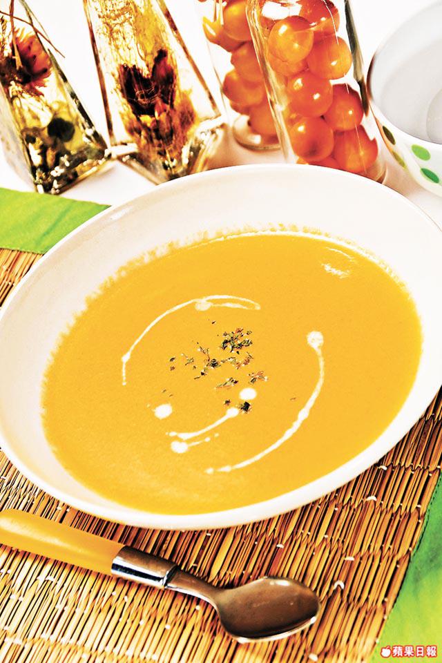 南瓜(去皮去籽)200克、紅蘿蔔50克、雞湯300毫升、濃豆漿200毫升、番荽碎適量、鹽適量