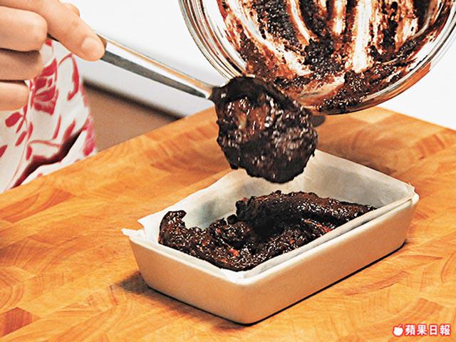 3. 將牛油紙鋪入淺盤,倒入芝士朱古力漿,放入雪櫃冷藏至凝固。