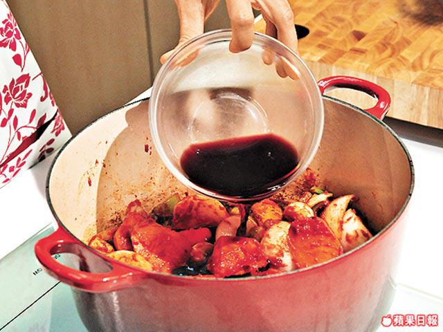 3. 燒熱鍋放入橄欖油,加入洋葱、蒜、紅蘿蔔、西芹、茄膏用大火炒香。注入紅酒煮滾。