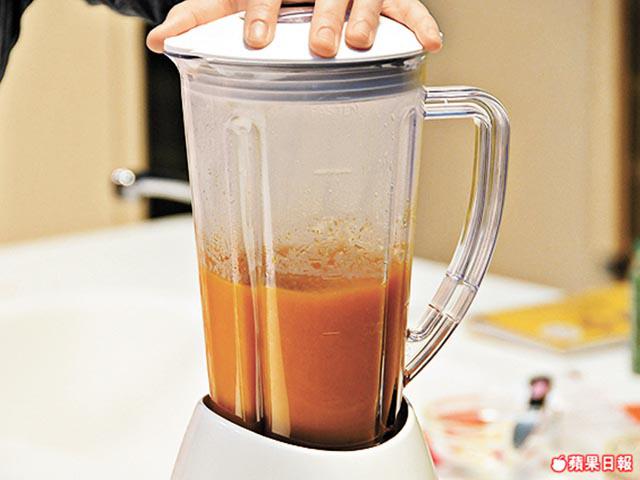3. 將湯汁放入攪拌器打爛後,倒回煲中。