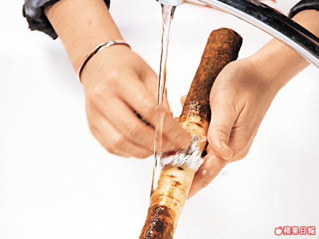 牛蒡連皮都有營養所以不必去皮,只用錫紙冲刷即可,另外因為含鐵質,切開後容易氧化,所以放入稀醋水浸,可以防止氧化變色。用剩的牛蒡,可用報包裹放入雪櫃蔬果箱,不易變乾。