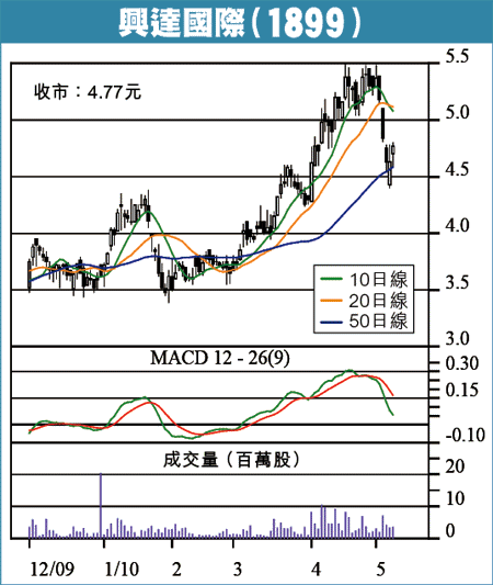 興達國際(1899)踏入5月以來,股價大幅滑落,短短幾日之內,由接近5.50元水平跌到4.40元,昨日跟大市反彈,收4.77元,升0.14元,短期似有見底回升之勢,可趁低收集。中國車市銷售前途向好,興達前景樂觀。