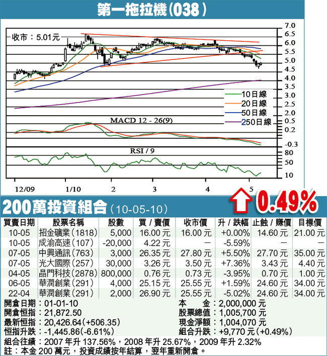 大勢尚未明朗,主要策略仍是候低吸納,對象之一是備受國策眷顧的第一拖拉機(038)。一拖今年1月高見6.65元後反覆調整,形成三角形,上月尾跌破形態底部,量度跌幅目標為4.00元,而250日線目前在4.028元,兩者相當接近,將構成有力的支持。