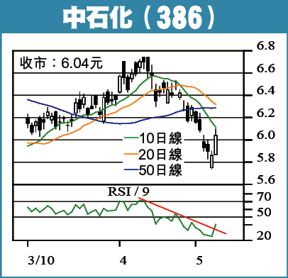 中石化(386)昨收6.04元,升3%。股價上周五跌至5.74元回升,並單日轉向,昨天進一步推高,股價突破近日的下降阻力軌,9RSI及MACD均轉好,技術上可反覆上試6.3至6.4元阻力區,升破此區域,股價可向4月高位6.74元推進,破位可延續之前的升浪。