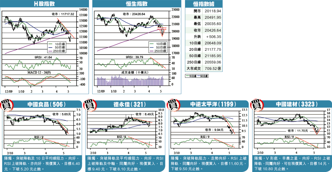 日線圖呈大陽燭,直逼20500阻力區,並以接近高位收市,如果今日能呈現裂口上升,將形成島形底,在相對低位呈此走勢,對大市有相當的穩定作用。另外,250日線(20559)亦有機會失而復得,而不是持續收在其下,對大市氣氛亦是有利。相反,大市如出現回調,則顯示昨日的反彈不過是下破重要支持的後抽而已。這種一邊天堂、一邊地獄的走勢,年初以來似乎從未間斷,但往往走勢未能持續,形成了有波幅而無升跌幅的大型上落市格局。