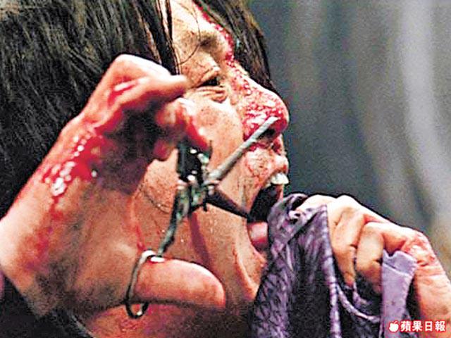 內地《荊軻傳奇》劇照,英文版的高漸離咬舌自盡。
